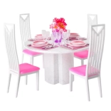 Ce set de meubles bien pensé transforme toute maison de poupée en salle à manger chaleureuse. Grâce aux détails réalistes – des sets de table roses aux assiettes et couverts jusqu’aux verres – les enfants profiteront de longues heures de jeu imaginatif et de dînettes avec leurs poupées.