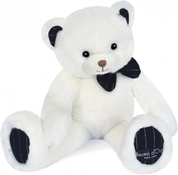 Adorable ours en peluche couleur ivoire avec nœud papillon rayé bleu foncé, compagnon idéal pour le lit comme pour décorer la chambre. Conçu en peluche premium, toute douce, conforme aux normes européennes CE et adapté dès la naissance. Livré dans une magnifique boîte cadeau, parfait pour Noël ou pour fêter une naissance.