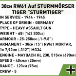 Avec ce kit, vous pouvez construire le Sturmtiger, une pièce d’artillerie blindée allemande de la Seconde Guerre mondiale, basée sur le châssis du char PzKpfw VI Tiger. Le modèle à l’échelle 1:28 est composé de 1100 éléments de haute qualité et regorge de détails, comme des chenilles fonctionnelles et un canon mobile. Le kit inclut également un mini modèle de moteur amovible, pouvant être placé sous la trappe de service.