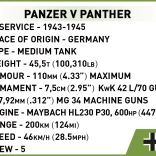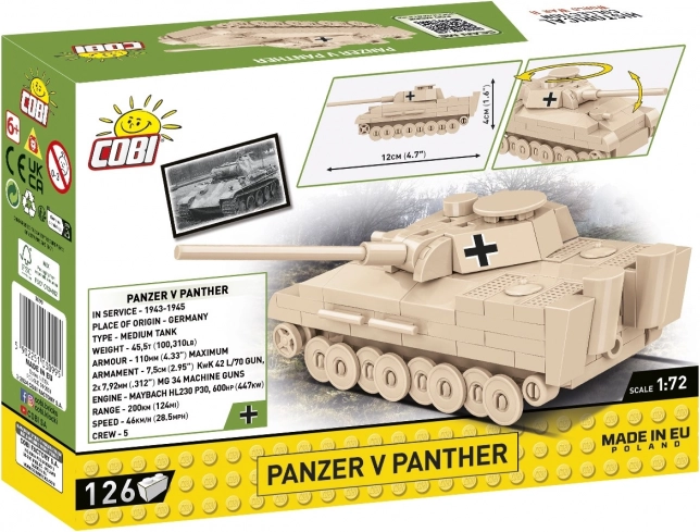 Mini modèle du légendaire char Panzer V Panther de COBI à l’échelle 1:72 composé de 126 pièces, idéal pour les débutants comme pour les collectionneurs. Il offre une tourelle rotative, un canon mobile et des impressions de qualité avec marquages historiques. Fabriqué dans l’UE, entièrement compatible avec d’autres marques, avec une notice illustrée claire.