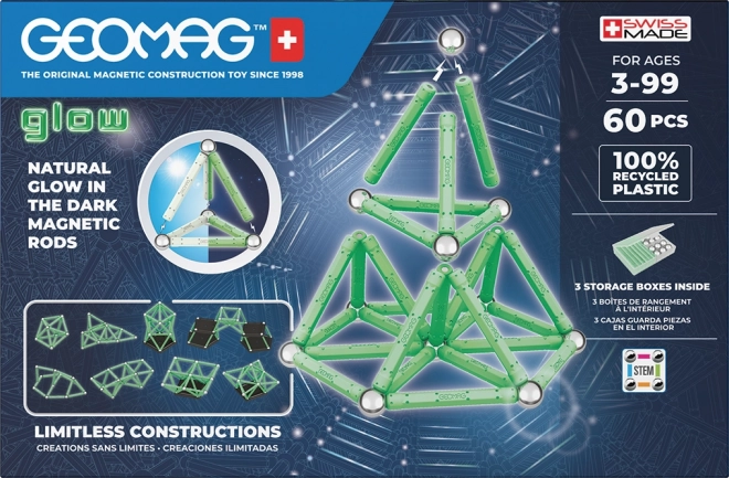 Le set Geomag Glow allie amusement et apprentissage. Les tiges magnétiques lumineuses s’illuminent à la tombée de la nuit et transforment chaque modèle en un spectacle lumineux captivant. Les pièces sont fabriquées en plastique 100 % recyclé, pour un jeu à la fois ludique et durable.