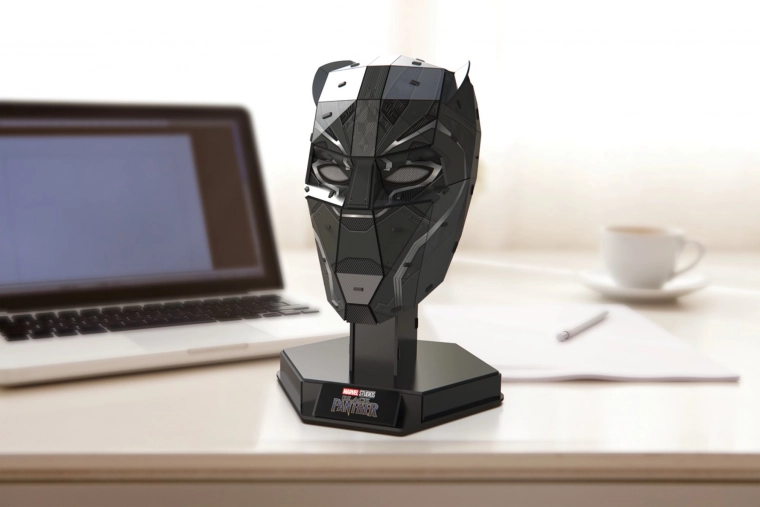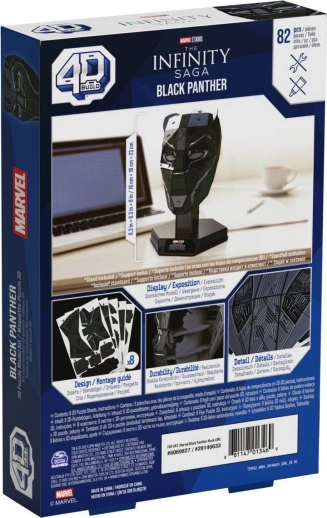 Assemblez le masque 4D BLACK PANTHER de MARVEL : 82 pièces, sans colle, socle inclus. Modèle détaillé 16 × 16 × 23 cm pour fans des Avengers 14+.