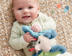 Des oreilles duveteuses et généreuses, ainsi que des détails satinés, invitent à serrer, caresser et explorer différentes surfaces – idéal pour développer le toucher et apaiser l’endormissement.