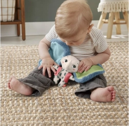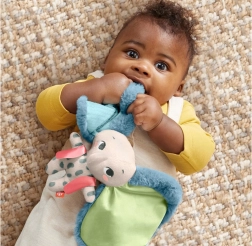 Ce doudou sensoriel en forme d’éléphanteau offre de riches stimuli tactiles : peluche douce, détails satinés et éléments bruissants. Les nuances contrastées de bleu et de vert attirent le regard et favorisent le développement de la vue, tandis que ses formes faciles à saisir aident à exercer la motricité fine et la coordination main‑œil.