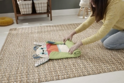 Le tapis est fabriqué avec un textile contenant 90 % de plastique recyclé et livré dans un emballage certifié FSC. Grâce à sa conception astucieuse, il se roule facilement, se fixe avec des « pattes » et vous accompagne partout. Les jouets amovibles se clipsent aisément sur les boucles, pour un jeu toujours renouvelé et stimulant.