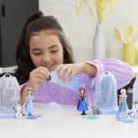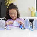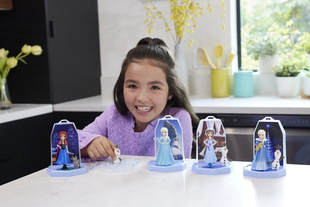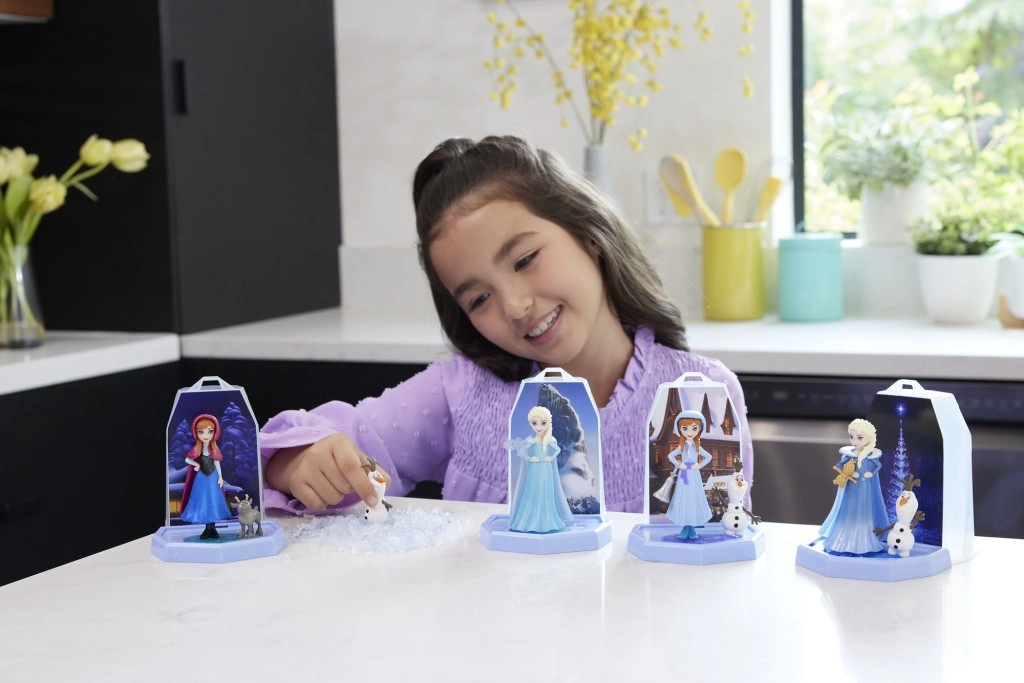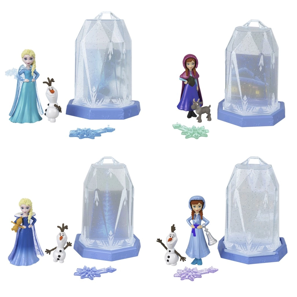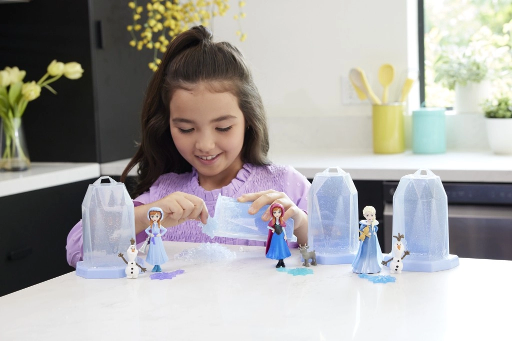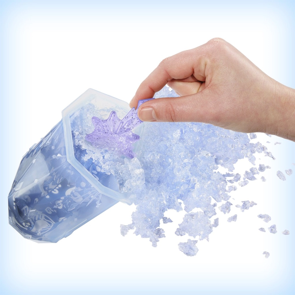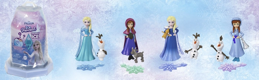 Cette collection de petites poupées à surprises offre une expérience de déballage innovante grâce à Squishy Ice™ – un mélange de gelée bleu glacé. À l’aide de la pelle incluse, les enfants fouillent le récipient rempli de Squishy Ice™ et découvrent les trésors à l’intérieur : une petite poupée Anna ou Elsa, un personnage ami et 4 éléments de jeu.