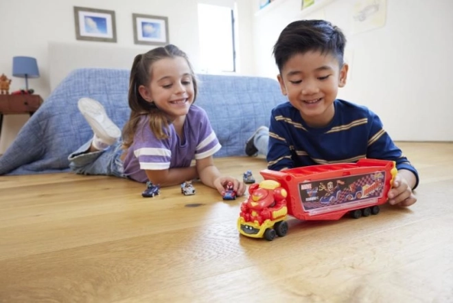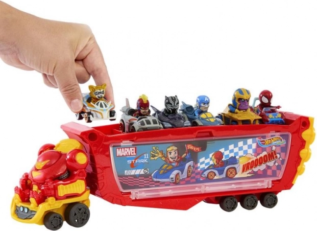 Les enfants peuvent détacher la cabine avant et jouer avec séparément. En relevant le casque, on découvre une figurine fixe de Tony Stark sur le siège du conducteur, idéale pour développer des histoires et des scénarios créatifs. Le transporteur peut accueillir jusqu’à 10 voitures Hot Wheels RacerVerse ou des modèles Hot Wheels standard à l’échelle 1:64.