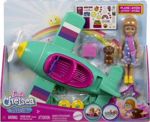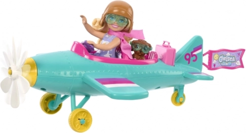 Poupée CHELSEA pilote, avion (2 places), chiot, valisette, lunettes pour la poupée, lunettes pour le chiot, casque, autocollants, petit drapeau