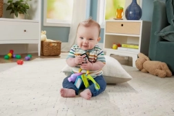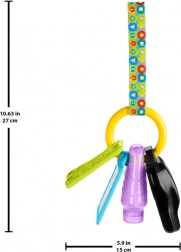 Chaque pendentif sur l’anneau apporte une sensation différente : la clé musicale déclenche des sons de véhicules, des chansons et des phrases, le petit flacon à presser stimule le toucher, le miroir invite à la découverte de soi et l’anneau de dentition texturé soulage pendant les poussées dentaires. Grâce à sa structure légère, le jouet est idéal pour la poussette, la voiture ou le jeu à la maison.