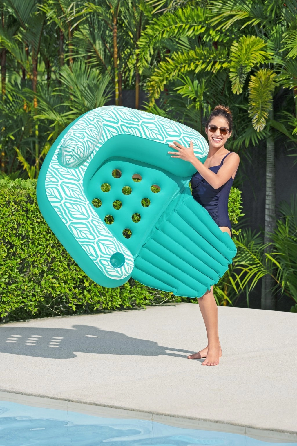 Trois chambres à air et valves de sécurité pour une flottabilité stable ; le porte-boisson intégré garde votre rafraîchissement toujours à portée de main.