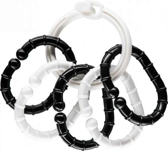 Des anneaux contrastés noir et blanc avec pendentifs qui favorisent le développement de la vue et de la motricité fine dès la naissance. Ils sont en plastique et silicone de qualité, adaptés dès 0+ et testés selon la norme EN 71 (parties 1–3 et 9) pour une utilisation quotidienne en toute sécurité.