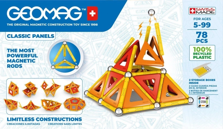 Geomag vous permet de créer d’innombrables constructions à partir de panneaux colorés et de tiges magnétiques.