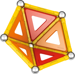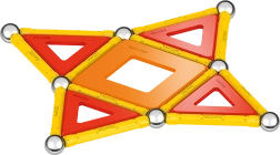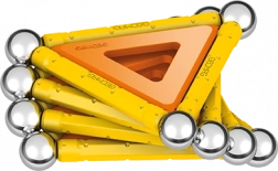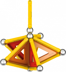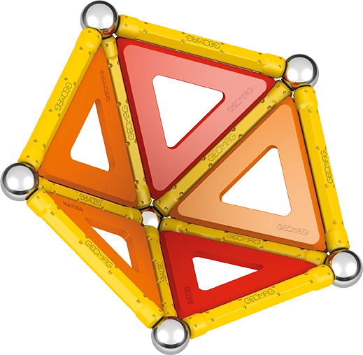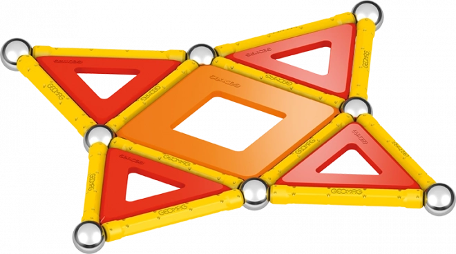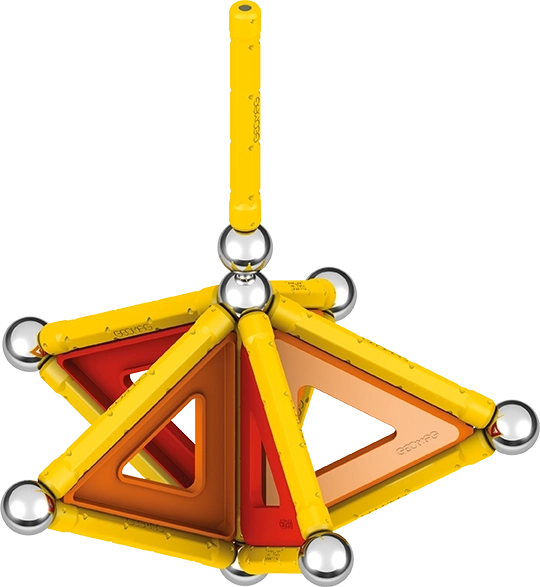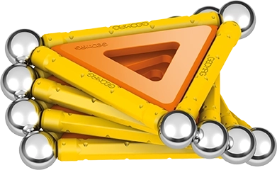 Contenu de la boîte : 12 tiges magnétiques jaunes, 12 billes en acier, 8 inserts triangulaires, 2 inserts carrés, 1 insert orange en forme de pentagone et une boîte en plastique pour ranger billes et tiges.