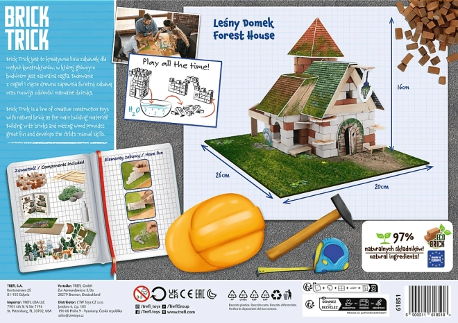 Construisez une maison forestière avec de véritables briques et des éléments décoratifs. Avec les produits Brick Trick, vous découvrirez certains monuments populaires et appréciés et, surtout, vous aurez la possibilité de les construire depuis les fondations. Posez brique après brique, coupez et collez les planchettes, progressez des fondations jusqu’au bâtiment terminé et, pour finir, décorez votre création avec les ornements fournis. Construisez étape par étape selon la notice ou trouvez et réalisez vos propres solutions. Donnez vie à votre construction achevée grâce aux figurines en papier. Si vous combinez plusieurs sets TREFL Brick Trick, vous pouvez créer un village pittoresque, une ville moderne ou une colonie médiévale. La boîte de construction peut être utilisée à plusieurs reprises (la colle est soluble dans l’eau). Niveau de difficulté : 3,5 Contenu de l’emballage : - plus de 220 petites briques en argile naturelle - plaques en bois - plaque de base - éléments décoratifs - autocollant - colle - notice illustrée Les kits Brick Trick du fabricant TREFL améliorent la dextérité, développent l’imagination et favorisent la concentration.