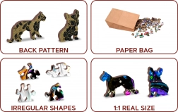 Ce puzzle est double face, ce qui signifie que vous pouvez l'assembler selon l'image du recto ou selon le motif de forme au verso. Un design écologique assure qu'il n'y a pas d'emballages plastiques, uniquement un sac et une boîte en papier.