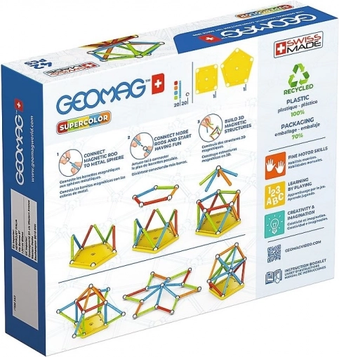Découvrez un univers créatif avec le jeu de construction magnétique GEOMAG Supercolor Panels Recycled composé de 42 pièces. Des aimants puissants, des panneaux colorés et des billes métalliques permettent de bâtir une grande variété de constructions 2D et 3D, tout en développant la motricité fine, la représentation spatiale et la créativité. Fabriqué en plastique 100 % recyclé – un plaisir respectueux de la planète.