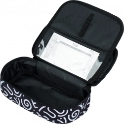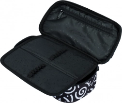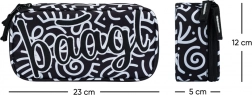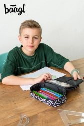 La trousse se vante d'un aspect textile noir et blanc avec des motifs abstraits et l'inscription 'Baagl'. Son design stylé est idéal pour ceux qui prêtent attention à la mode même dans leurs fournitures scolaires.