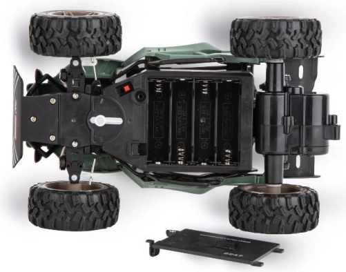 Cette voiture est conçue pour rouler sur des terrains exigeants grâce à ses pneus robustes et à sa suspension polyvalente.