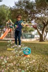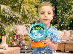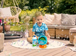 Des couronnes rotatives et un moteur génèrent automatiquement un flux continu de bulles irisées pour s’amuser aussitôt, dehors comme dedans.