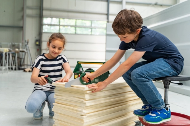 La valise est fabriquée en Allemagne en plastique résistant et garde toutes les pièces bien regroupées. Grâce à la compatibilité avec les systèmes de vis BOSCH et Technico, les enfants peuvent élargir leur équipement et développer leur motricité fine, leur créativité et leur esprit technique.