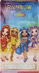 La poupée a de longs cheveux violets qui sont parfaitement assortis à ses grands yeux bleus. Une tenue brillante et tendance accompagnée de lunettes de soleil violettes apporte un thème de mode au jeu.