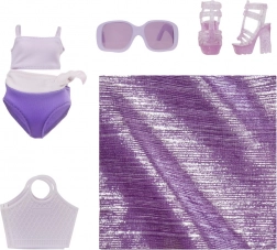 Les accessoires incluent des vêtements violets, des lunettes de soleil, des chaussures et un petit sac à main, permettant des variations et thèmes de mode divers comme la plage ou l'été.