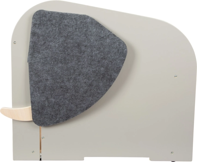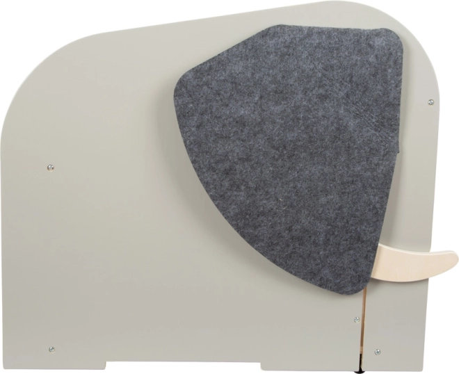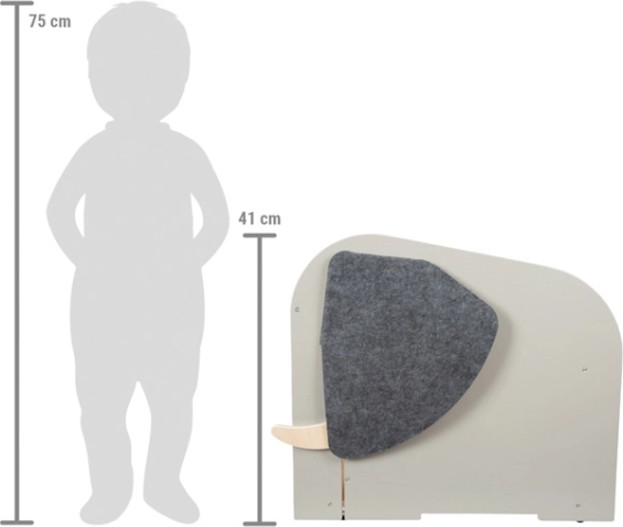 Le coffre propose un vaste espace pour ranger même les plus grands jouets, des compartiments frontaux pour livres et fournitures d’écriture, et cache entre les « défenses » une tige coulissante pour suspendre un rouleau de papier à dessin. De grandes oreilles en feutre de qualité recouvrent des ouvertures secrètes, la « queue » d’éléphant pivotante sert de poignée pratique pour ouvrir et fermer et peut dissimuler de petits objets.