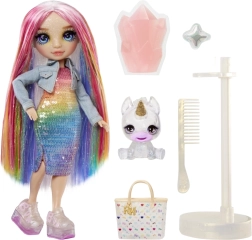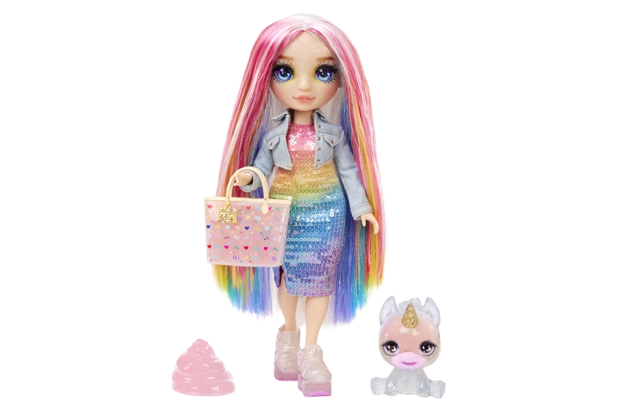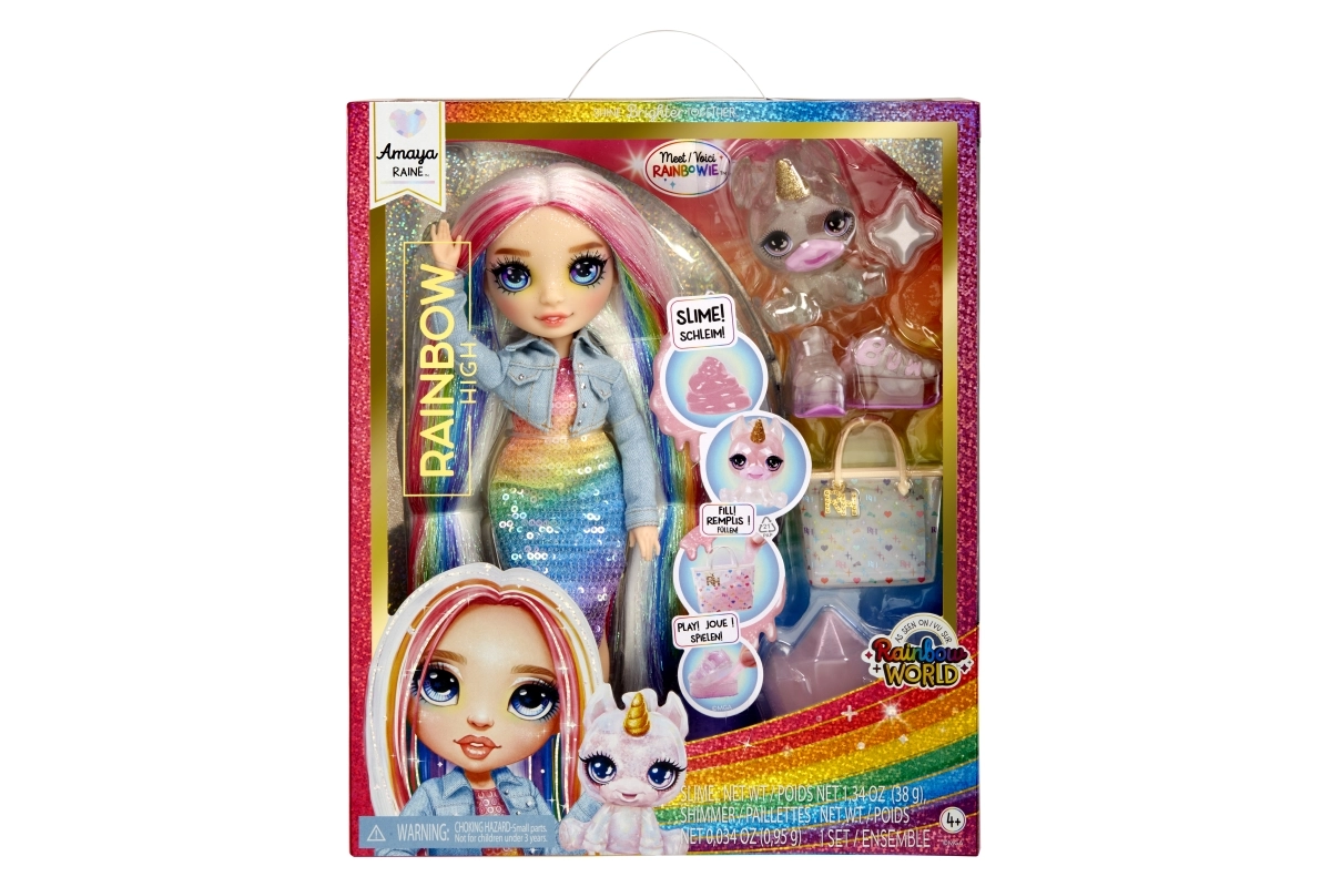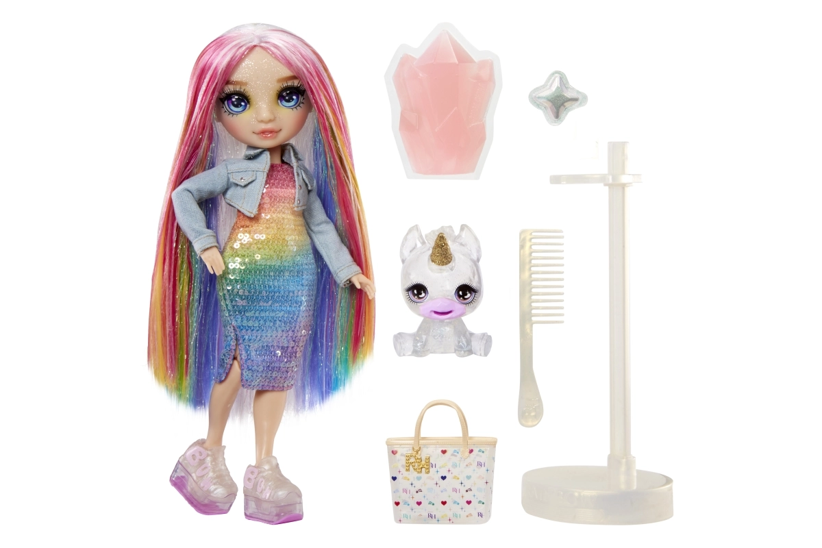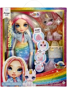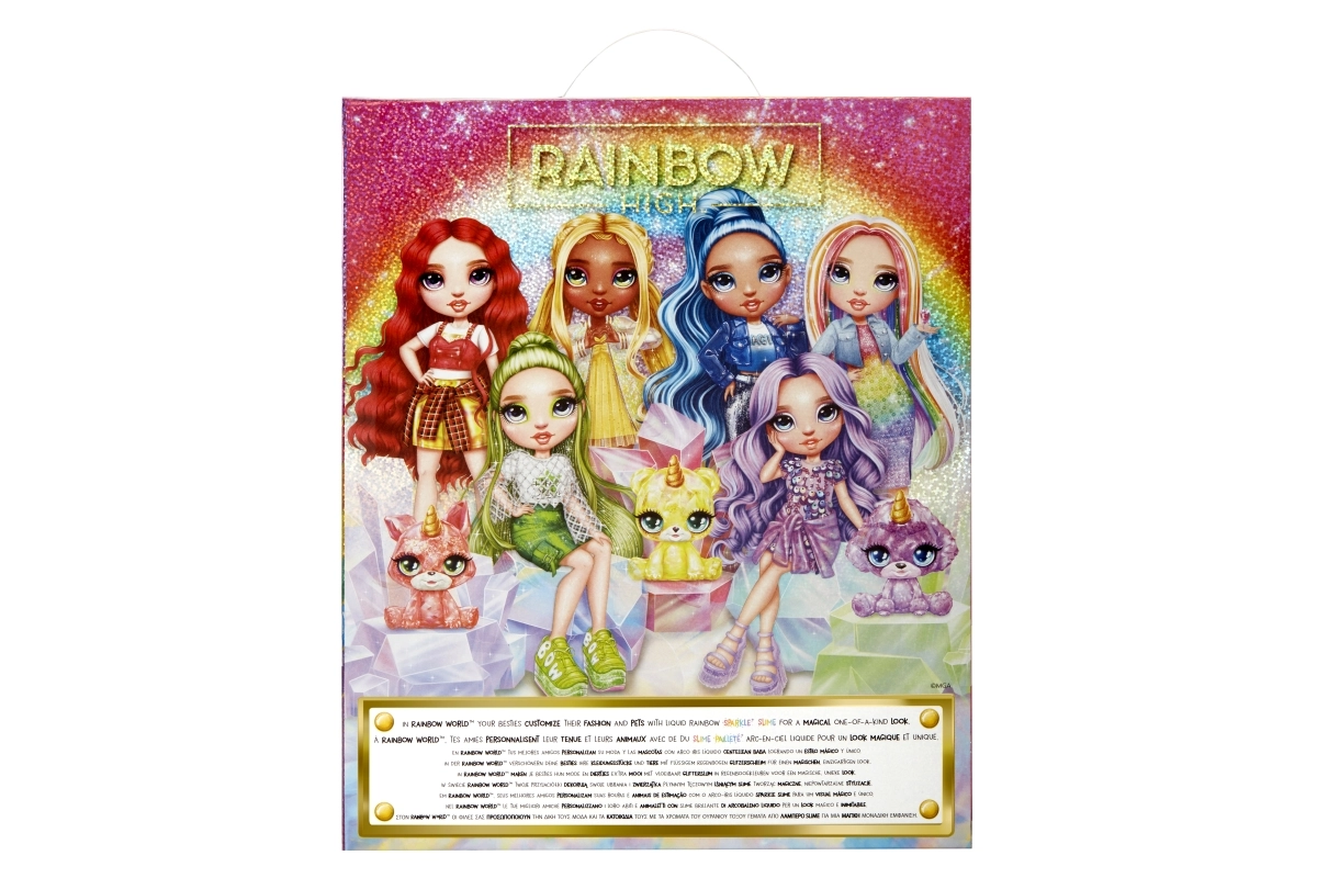 Inclus également, un adorable compagnon licorne et un slime en gel que vous pouvez étirer, presser et utiliser pour décorer les accessoires – sac transparent ou chaussures à plateforme. Après le premier déballage, un léger lavage des cheveux suffit pour les rendre doux et brillants. La collection est complétée par des personnages appréciés comme Violet, Skyler, Jade, Sunny et Ruby – collectionnez-les et créez votre univers arc-en-ciel.