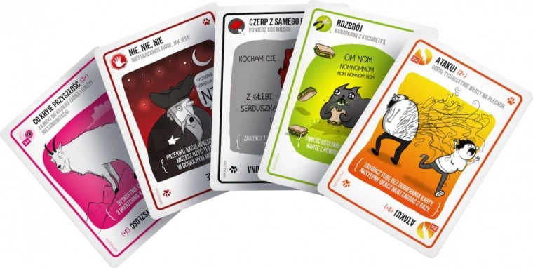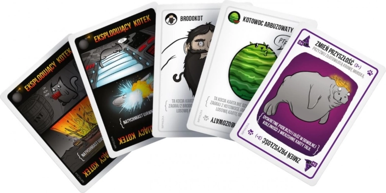 Exploding Cats est une variante féline et totalement sûre de la roulette russe. À chaque tour, les joueurs piochent une carte jusqu’à ce que quelqu’un tire un chaton explosif – à ce moment-là, le malchanceux explose et meurt, mettant fin à la partie. Heureusement, le paquet contient aussi des cartes qui permettent de retarder l’inévitable ou de désamorcer la bombe miaulante avec un pointeur laser, une caresse sur le ventre ou un sandwich aux friandises pour chats. Pour gagner, il faut gérer sagement les cartes dont on dispose.