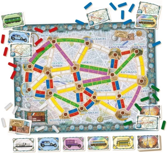Dans cette suite dynamique du jeu Embarquement dans le train, les joueurs rivalisent pour visiter les sites touristiques les plus célèbres de la capitale française en validant leurs billets. Pour gagner, il faut non seulement exploiter intelligemment le réseau grandissant des transports en commun parisiens, mais aussi choisir des liaisons pour célébrer un nouvel anniversaire de la prise de la Bastille.
