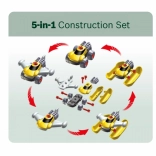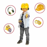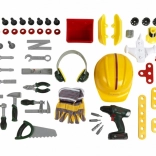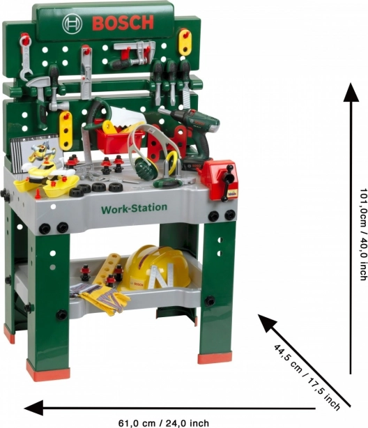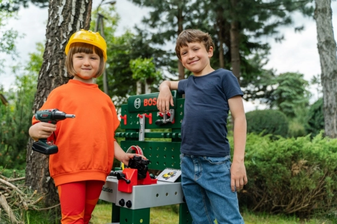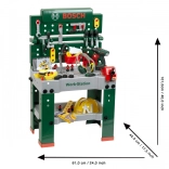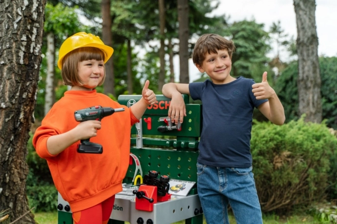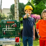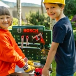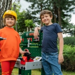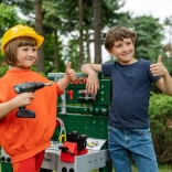 Entièrement équipé, l’établi pour enfants est fabriqué en Allemagne sous licence Bosch. Le plateau de table offre de nombreuses fonctions imaginatives, un étau, des espaces de rangement pratiques et un casier. Sur le panneau arrière de l’établi et sur l’étagère sous le plan de travail, il y a de la place pour un ensemble d’accessoires de qualité de 81 pièces, dont certains peuvent être accrochés au mur à l’aide de crochets pratiques : tournevis électrique pour enfants sur batterie, tournevis plat et cruciforme, clé, clé à douille, pince et lime, marteau, scie et mètre, équerre, règle et serre-vis. Les enfants apprennent à manipuler habilement vis, écrous et éléments à visser de différentes tailles et formes, et à veiller à la sécurité grâce aux casques et lunettes de protection jouets, aux protections auditives rembourrées et aux gants. Particulièrement amusant : le véhicule à assembler soi-même, qui peut être pivoté et retourné sur le poste de travail. La chambre d’enfant se transforme ainsi en atelier ! Il suffit d’enfiler le casque et les lunettes de protection, de mettre les gants et c’est parti pour scier, marteler et visser. Les petits bricoleurs sont aidés par l’étau, qui maintient les lattes destinées à être fixées avec des clous ou des vis. Un tournevis sans fil est également disponible : avec lumière et son, il visse tout ce que les enfants veulent assembler en quelque chose de grand ; et une fois le travail terminé, tout peut être rapidement rangé sur les crochets et dans les boîtes.
