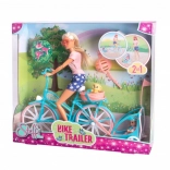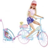 Steffi à vélo avec une remorque, incluant un enfant, un chien et un casque.
