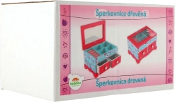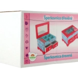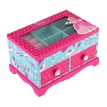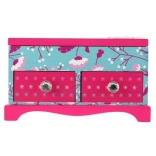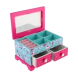 Élégante boîte à bijoux pour enfants en bois de qualité avec un couvercle rabattable et deux tiroirs, idéale pour ranger bijoux et petits trésors. Elle se distingue par un design coloré aux motifs floraux et d’oiseaux dans une combinaison rose et bleu, agrémenté d’un motif de princesse. Un agencement intérieur pratique et un petit miroir intégré facilitent l’usage quotidien dans la chambre d’enfant.