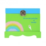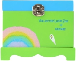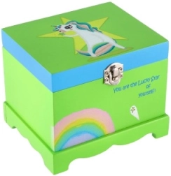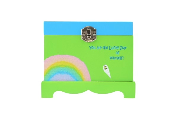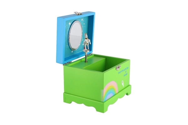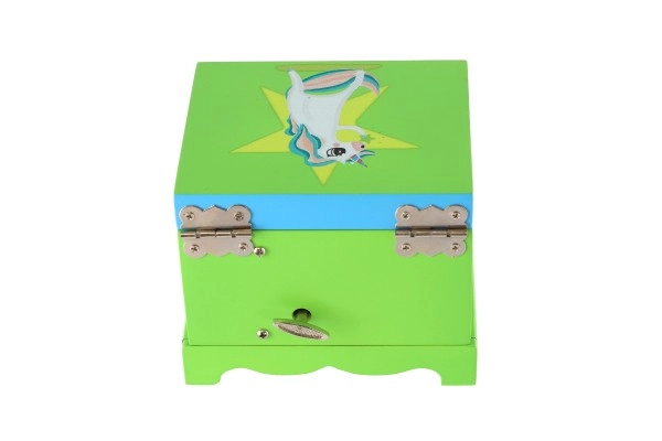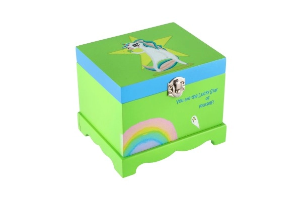 La structure en bois robuste avec fermeture métallique et un charmant motif de licorne et d’arc-en-ciel convient à toute chambre d’enfant. Ses dimensions compactes permettent de la poser sur une étagère ou une commode tout en offrant suffisamment d’espace pour bagues, boucles d’oreilles et petits souvenirs.