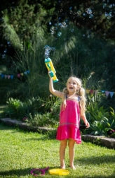 L’utilisation est simple – plongez la tête dans la coupelle de solution et appuyez sur la gâchette. La poignée ergonomique convient aux mains des enfants et la construction plastique légère est confortable à tenir. Le jouet est conçu pour une utilisation en extérieur et fonctionne avec 4× piles AA (non incluses).