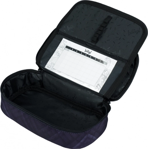Grâce à la cloison rabattable et à la poche intérieure zippée, vous aurez crayons, stylos, gomme et petits objets toujours à portée de main. La poche pour l’emploi du temps aide à planifier la journée scolaire. La trousse est fabriquée en matériau recyclé, plus respectueux de la nature.