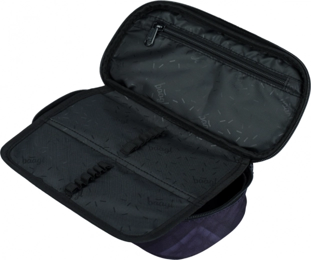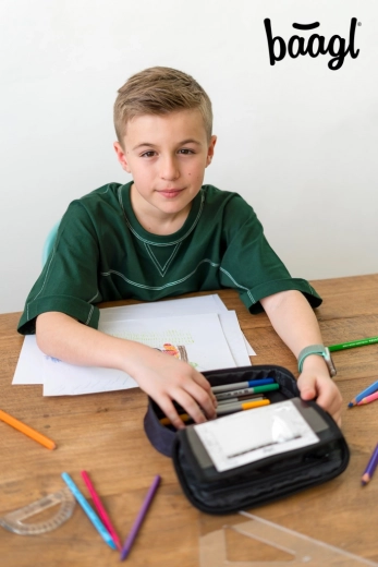 Trousse scolaire BAAGL Goal élégante avec motif de ballon de football, offrant une structure rigide, une cloison rabattable pratique, une poche intérieure zippée et une poche pour l’emploi du temps. Fabriquée en matériau recyclé et équipée de fermetures éclair YKK de qualité. Sans contenu – prête pour vos fournitures préférées.