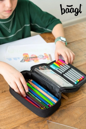 Trousse scolaire BAAGL Darkness élégante et résistante, offrant une organisation pratique des fournitures d’écriture pour l’école comme pour le bureau. Elle dispose d’un rabat intérieur, d’une poche intérieure zippée, d’une poche pour l’emploi du temps et de fermetures éclair YKK de qualité. Fabriquée en matériau recyclé et livrée sans contenu.
