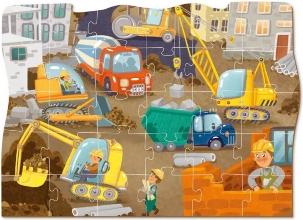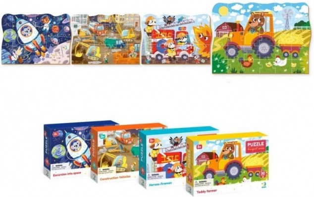 La série de puzzles TRANSPORT de la marque DODO propose de magnifiques illustrations de moyens de transport. Ce puzzle en particulier représente des machines de chantier et peut être relié à d’autres scènes, comme la ferme, l’espace ou les secours incendie.