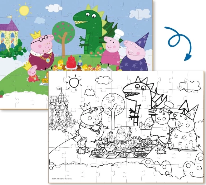 Ce puzzle recto-verso offre une double dose d’amusement. Les enfants commencent par assembler une scène joyeuse avec les personnages préférés de Peppa Pig, puis ils peuvent colorier à leur guise le verso en noir et blanc une fois le puzzle terminé. Le puzzle assemblé mesure environ 32 × 23 cm, parfait pour une table d’enfant.
