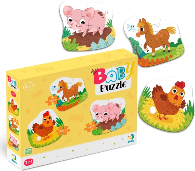 Ce coffret de puzzles bébé est un excellent choix pour une première découverte des puzzles. Les trois images en contour d’animaux de la ferme ont des nombres de pièces différents (2, 3 et 4), permettant à l’enfant de progresser pas à pas et d’éprouver la joie de la réussite à chaque image reconstituée.