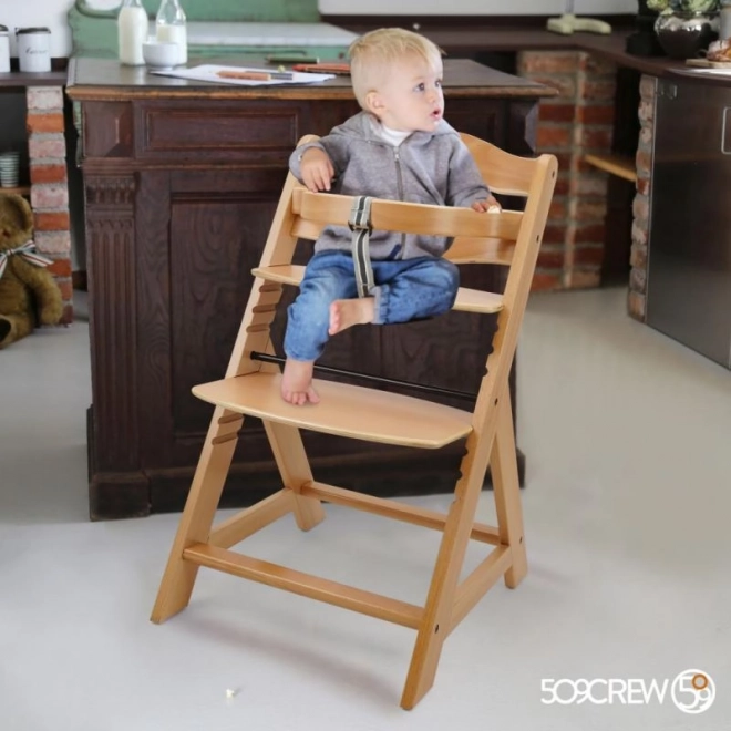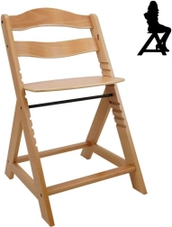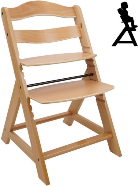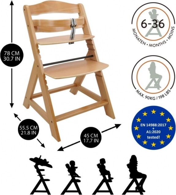 La chaise haute évolutive en bois est conçue pour offrir un maximum de confort et de sécurité aux enfants à partir de six mois. Elle est équipée d'un réglage de la hauteur du siège et du repose-pieds à plusieurs niveaux, pouvant servir de la petite enfance à l'âge adulte. Lorsque l'enfant grandit, la barre avant et le séparateur d'entrejambe peuvent être retirés et la chaise peut être transformée en une chaise normale. Elle est fabriquée en bois de hêtre allemand de haute qualité offrant stabilité et élégance. Sa capacité de charge maximale atteint jusqu'à 90 kg.