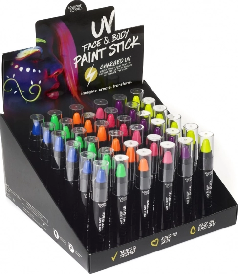 Nous vous présentons notre peinture UV pour visage et corps en stick, idéale pour créer des motifs étonnants et uniques sur la peau qui brillent dans l’obscurité sous lumière UV. Fabriquée avec des ingrédients de haute qualité et respectueux de la peau, elle s’applique et se rince facilement à l’eau.