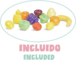 Comprend 12 pièces de fruits en plastique colorés, favorisant la reconnaissance des aliments et le développement de l’imagination lors du jeu de marchande.
