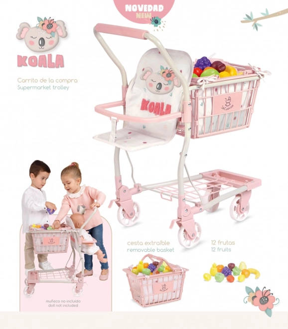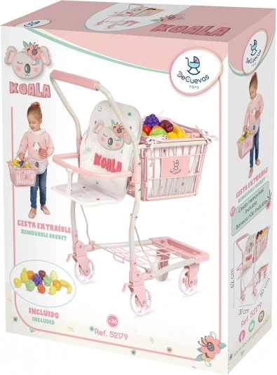 Adorable chariot de courses pour enfants 2‑en‑1 de la collection KOALA, combinant un grand panier roulant avec siège pour poupée et un panier à main amovible. Il comprend 12 fruits en plastique, des roulettes avant pivotantes, des freins à l’arrière et un espace de rangement dans la partie inférieure. Maniement léger, finition de qualité et design délicat qui raviront chaque petite marchande.