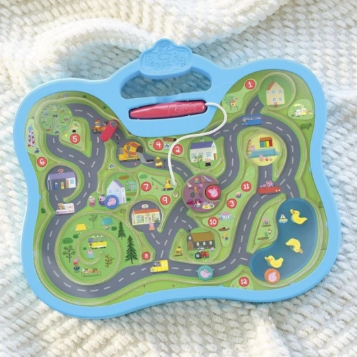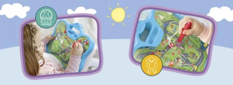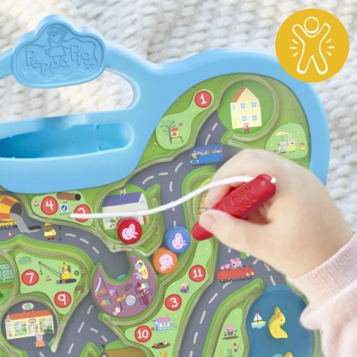 Le plateau stable avec poignée intégrée et stylet solidement attaché est parfait pour jouer à la maison comme en déplacement. Les étapes numérotées encouragent l’apprentissage des chiffres et des séquences, tandis que les illustrations colorées des lieux favoris des histoires de Peppa Pig captent l’attention et motivent à explorer davantage.