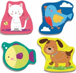 Découvrez les premiers puzzles pour tout-petits : 4 adorables puzzles en forme d’animaux domestiques. Chaque image se compose de 2 grandes pièces, permettant aux enfants de réussir rapidement et d’avoir envie de recommencer encore et encore. Les couleurs saturées et les illustrations amicales incitent naturellement au jeu.