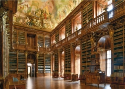 - Bibliothèque historique, intérieur avec fresques et étagères en bois