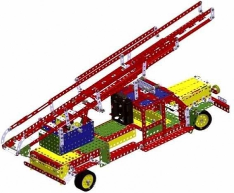 Des pièces spéciales et des instructions détaillées permettent de construire un grand camion de pompiers, une grue automotrice et d’autres modèles réalistes.