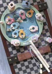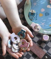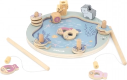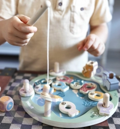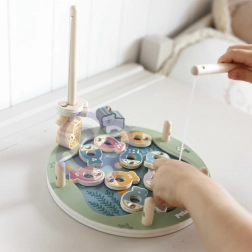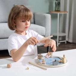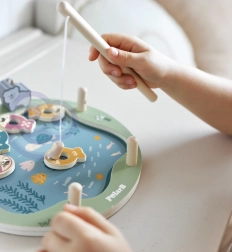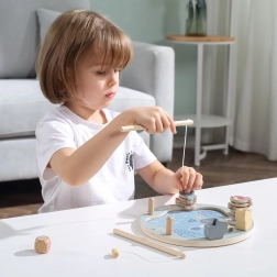 Le jeu de pêche magnétique en bois est un excellent choix pour les premières activités sociales. Les petits poissons colorés, numérotés et à points se pêchent à l’aide de cannes magnétiques, permettant aux enfants d’exercer de façon ludique le comptage, la concentration et la patience. Le dé ajoute du hasard et du suspense – gagne celui qui attrape le bon poisson.